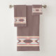 Cocoa brown towel with a border of a Native American, Aztec design in brown, mauve, grey and pink. There is also a set of towels in the store that are done entirely in the design so you can mix and match for a varied look. There's lots more coordinating items in the store too so you can make a stunning Southwestern or Native American bathroom.