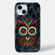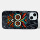 This is a decorative owl made by hand and stylised with Aztec patterns in black, red, turquoise and orange colours on a black marble background.