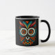 This is a decorative owl made by hand and stylised with Aztec patterns in black, red, turquoise and orange colours.