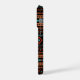 Aztec influenced pattern in symbols/motifs of rust colours and light teal on a black background design.