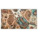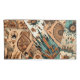 Aztec native American tribal design featuring a patchwork of boho southwestern blue and brown feathers, watercolor floral elements and geometric shapes.