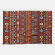 Aztec style pattern in a modern design in orange, yellow, blue and red detail on black. Pattern lines vertically set.