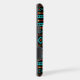 Aztec influenced and stylized mixed motifs pattern in teal, red, dark red and yellow on black.
