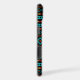 Aztec influenced and stylized mixed motifs pattern in teal, red, dark red and yellow on black.