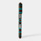 Aztec influenced and stylized mixed motifs pattern in teal, red, dark red and yellow on black.