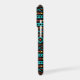 Aztec influenced and stylized mixed motifs pattern in teal, red, dark red and yellow on black.