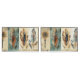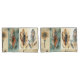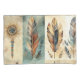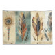 Aztec native American watercolor tribal design of 3 colour blocked feathers and medicine stick on blue and desert sand background.