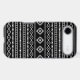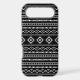 Aztec mixed motifs pattern in black, white and grey detail on a black background monochrome design.