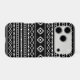 Aztec mixed motifs pattern in black, white and grey detail on a black background monochrome design.