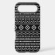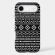 Aztec mixed motifs pattern in black, white and grey detail on a black background monochrome design.