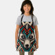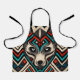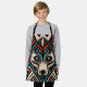 This is a decorative wolf face made by hand and stylised with Aztec patterns in black, red, turquoise and beige colours.