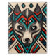 This is a decorative wolf face made by hand and stylised with Aztec patterns in black, red, turquoise and beige colours.