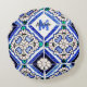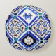 Azulejo Spanish Pattern Tiles Navy White Monogram Round Cushion