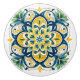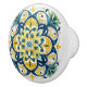 This ceramic knob displays a radiant floral medallion in golden yellow, deep navy, and fresh green, with fine detailing inspired by azulejos—the traditional hand-painted glazed tiles of Portugal and Spain. The symmetrical pattern combines pointed petals, scrolling flourishes, and leafy accents, radiating from a star-shaped centre. The crisp white background enhances the vivid colours, giving the piece both brightness and elegance.