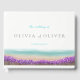 Wedding Guest Book with Bright azure and pink magenta nature landscape with blooming coast and mountains. Sunny Nature floral landscape. Silhouettes of mountains, sea coast and bright pink and purple flowers. Watercolor painting background Wedding Guest Book. Azure Coast in Bloom Collection.