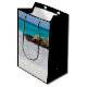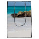 Gift bag with a beautiful photograph. A white sandy beach, with a gentle surf. Tropical turquoise water surrounds a jagged rock.