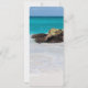 Menu card with a beautiful photograph. A white sandy beach, with a gentle surf. Tropical turquoise water surrounds a jagged rock.