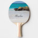 Personalised ping pong paddle with a beautiful photograph. A white sandy beach, with a gentle surf. Tropical turquoise water surrounds a jagged rock.