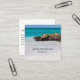 Business cards with a beautiful photograph. A white sandy beach, with a gentle surf. Tropical turquoise water surrounds a jagged rock.