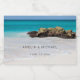 Wedding bottle labels with a beautiful photograph. A white sandy beach, with a gentle surf. Tropical turquoise water surrounds a jagged rock.