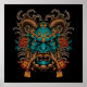 A fearsome, blue oni mask takes centre stage, its sharp features and menacing expression conveying a sense of power and aggression. The mask is adorned with intricate gold details and has long, curved horns. Surrounding the mask are swirling waves, cherry blossoms, and a prayer bead string.