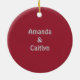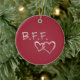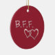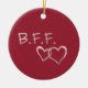 The letters BFF and linked hearts in a pink watercolor. Customize the background color and the names on the back of the ornament.