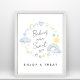 Cute whimsical boho baby boy shower take a treat poster sign featuring pastel blue and yellow watercolors of a rainbow, sun, hearts, stars, moons and clouds and "Babies are Sweet" in a stylish calligraphy script.