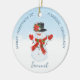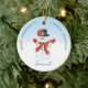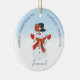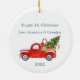 Baby 1st Christmas ornament with Joyful Snowman and red truck with Christmas tree and presents.