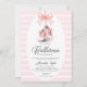 An enchanting watercolor illustration featuring a pair of baby ballerina shoes hanging from a satin pink bow, on a scalloped frame with delicate pink stripes, decorates this elegant and adorable baby girl shower invitation. Perfect for a ballet themed baby girl shower invitation, for a mum who loves the little ballerina idea or loves ballet herself.