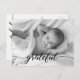 Personalised with baby's photo on the front and special message on the back. This design uses the word "Grateful" in an elegant script hand-lettering style font for a touch of sophistication. Express your excitement in announcing the birth of your child and send your gratitude at the same time.