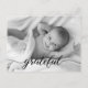 Personalised with baby's photo on the front and special message on the back. This design uses the word "Grateful" in an elegant script hand-lettering style font for a touch of sophistication. Express your excitement in announcing the birth of your child and send your gratitude at the same time.