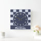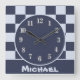 Do you know a little guy who has recently joined your circle of friends and family? This baby nursery wall clock features a square pattern quilt design in alternating dark and light blue colours and is personalised with the special little guy's name. A solid dark blue banner at the bottom displays the name which can quickly be personalised.