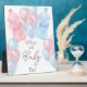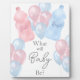 This baby gender reveal party sign features a cute pink and blue pastel colour theme. A pink baby bottle is placed on the left with "girl?" printed in an elegant script font. A soft blue coloured baby bottle is placed on the right with "boy?" printed over top. Pink and blue party balloons accent the borders of the invitation. The question, "What will baby be?" is printed down the centre. You can have the guests of your gender reveal try to guess whether your new baby will be a boy or a girl.