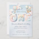 This adorable invitation features the word “ONE” illustrated with sweet bear faces and a whimsical hot air balloon, creating a magical and gentle vibe perfect for a little one’s big milestone. Set against a light sky blue background.