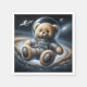 A teddy bear dressed in an astronaut suit is floating in space with a backdrop of swirling galaxies and celestial bodies