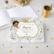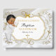 Beautiful baby boy in his christening suit and gold cross necklace. Background is white satin with a gold and silver glitter frame and bow embellishment. Back is adorned with gold ribbon on a white satin background.