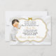 Beautiful baby boy in his christening suit and gold cross necklace. Invitation background is white satin with a gold and silver glitter frame and bow embellishment. Back is adorned with gold flower pattern & gold ribbon on a white satin background.