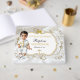 Beautiful baby in christening outfit. Background is white satin with a gold and silver glitter frame and bow embellishment. Back is adorned with gold ribbon on a white satin background.
