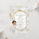 Baby boy in white suit with gold cross bible. Invitation background is white satin, gold filigree, a gold and silver glitter frame and bow embellishment. Back is adorned with gold flower pattern & gold ribbon on a white satin background.