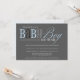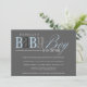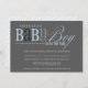 Baby shower invitation featuring the words "baby boy" in blue, grey and black with party details below.