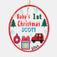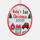 Baby boy first Christmas. Merry Christmas in fun snowcapped red typography. Child's Name in blue. 1st written in green (insert Any Age 1st, 2nd, 3rd). Insert YEAR, or backspace text to leave area blank. Fun snowflakes, trees, gift box, and cool red orange toy car. Peace on Earth written on backside of two-sided items. Designs by TamiraZDesigns.