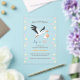 A stork is carrying a baby in a bundle. Lovely and original gender reveal invitation.