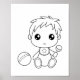 Cute cartoon baby boy dressed in a jumpsuit with a bib decorated with a tiny star. Toy ball is resting to the side. Made for easy colouring.