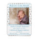 Design front features a white background with the pattern of tiny toy sailboats as background to the photo you provide. A blue stripe borders photo. Customisable heading and name of newborn is displayed in blue lettering against a white strip along with birth stats and information. All text is customisable.