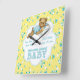 Sweet custom design in soft yellow and aqua blue with stars, baby bottles, and onsie outfits. Baby teddy bear laying on a pillow. Area below has text ready for you to customise with name and date of birth text. Bottom of banner has Welcome Sweet Baby text art.