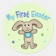 This cute baby's first Easter design features an adorable baby bunny wearing an aqua green bib and colourful polka dots. Fun blue and aqua text w/a green drop shadow says "My First Easter".
