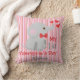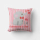 Cute personalised pillow with "My 1st Valentine's Day" written in shades of red and grey, and adorable elephant blowing red hearts out of his trunk on striped red, white and pink background. Easy to personalise with custom options. Use the 'Customise It' button to customise the product, or add text.