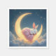 A fluffy white rabbit is cosily wrapped in a pink blanket, resting peacefully on a glowing crescent moon in a dreamy night sky.