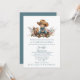 Adorable little baby cowboy sitting, with his stuffed horse toy decorates the top of this baby shower invitation. A solid white background on the invitation has clean federal blue custom text ready to personalise for your event. Lovely baby shower invitation with a western flare.