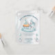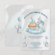 Cute baby elephant with a blue hat and birthday cake with one candle. The design is in a pastel blue-grey colour